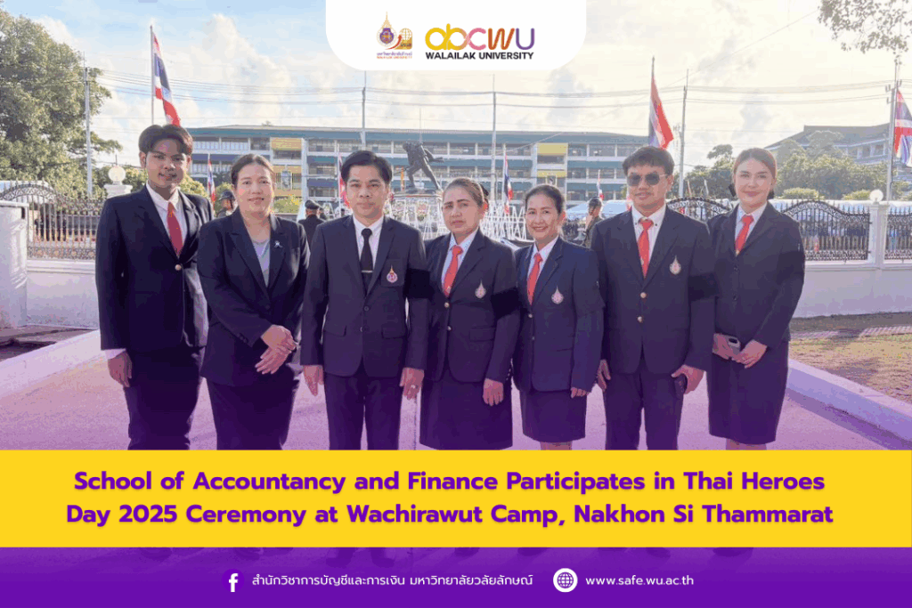 On 8 December 2025, the School of Accountancy and Finance, Walailak University, participated in the Thai Heroes Day 2025 wreath-laying ceremony held at the Thai Heroes Monument 2484, Wachirawut Camp, Mueang District, Nakhon Si Thammarat. The ceremony was organized to honor and commemorate the bravery and sacrifices of the Thai heroes who defended the nation.